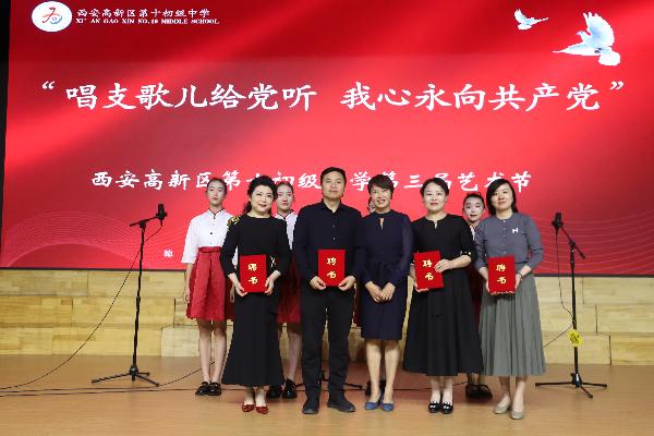 最后,合作双方共同参加高新十初“唱支山歌给党听,我心永向共产党”第三届艺术节,曹云老师带领学生合唱团现场演唱了《闲聊波尔卡》、《城南送别》2首歌曲,受到在场师生的高度赞扬!同时,高新十初为到场的4位老师颁发了“美育课程指导专家”聘书。